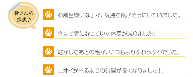 10倍に希釈して体にスプレーするとツヤツヤの毛並みに。シャワーをして良いペットには、薄めたウモプラスで体をふいたり、ブラッシングローションとして使用するのも最適です!!