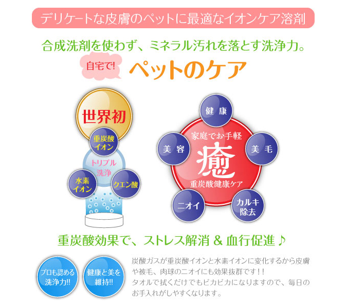 合成洗剤、合成界面活性剤を使用せず、重炭酸イオン、水素イオン、クエン酸の相乗効果により、皮脂の多いベタつきのある汗や、被毛・肉球にこびりついた臭いの元になるミネラル汚れを落とします。